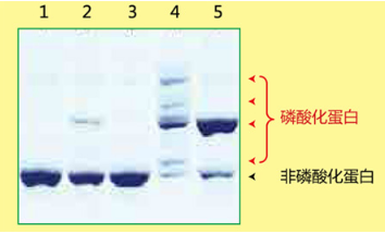 Phos-tag? SDS-PAGE 操作簡單,只需在常規(guī) SDS-PAGE 膠中加入 Phos-tag? Acrylamide 和 Mn2+ 或者 Zn2+ 即可進(jìn)行實(shí)驗(yàn)。在電泳過程中,磷酸化蛋白的磷酸基團(tuán)與 Phos-tag? 中的二價(jià)金屬離子相結(jié)合,降低其遷移速度,從而可區(qū)分磷酸化與非磷酸化蛋白。